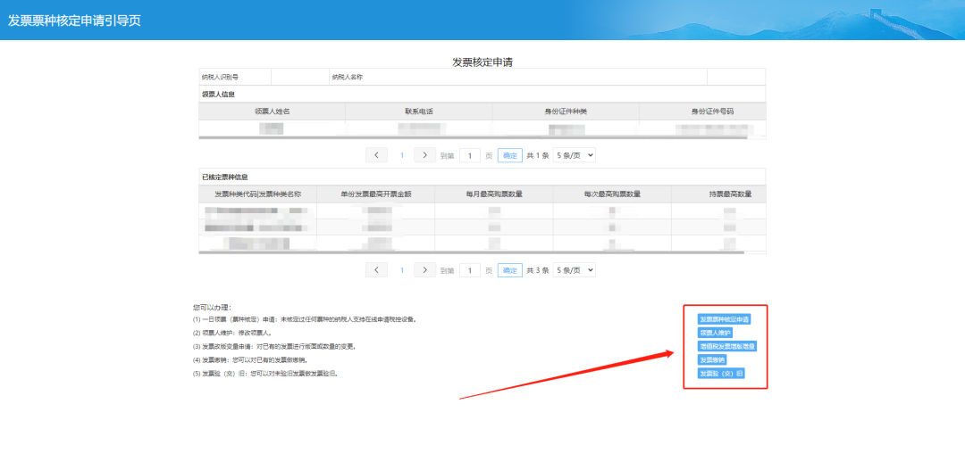 二、发票核定申请页面。进行发票票种核定申请、领票人维护、增值税发票改版变量、票e送的一站式套餐办理。