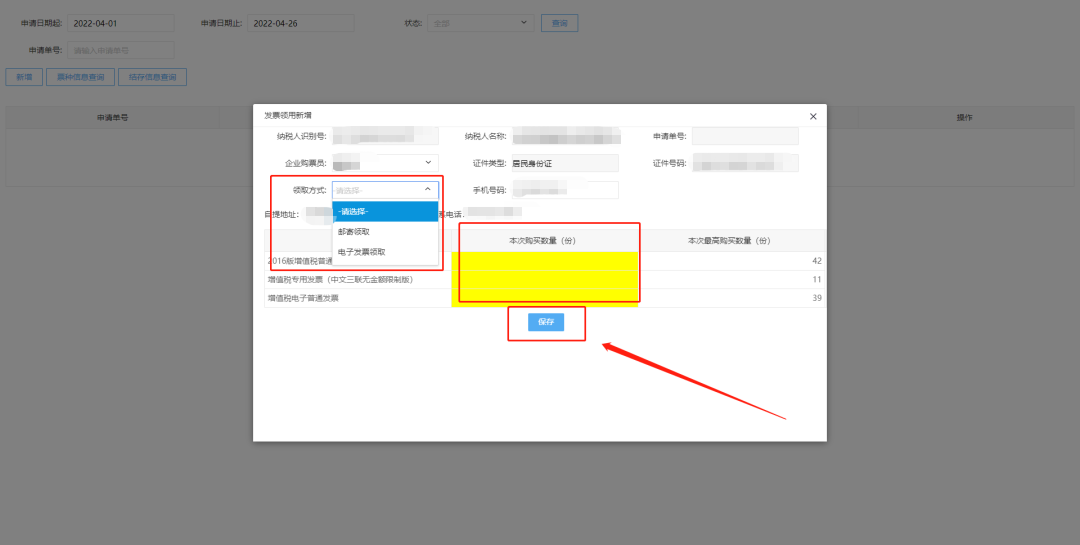 六、新增—领取方式—申领数量—保存。
