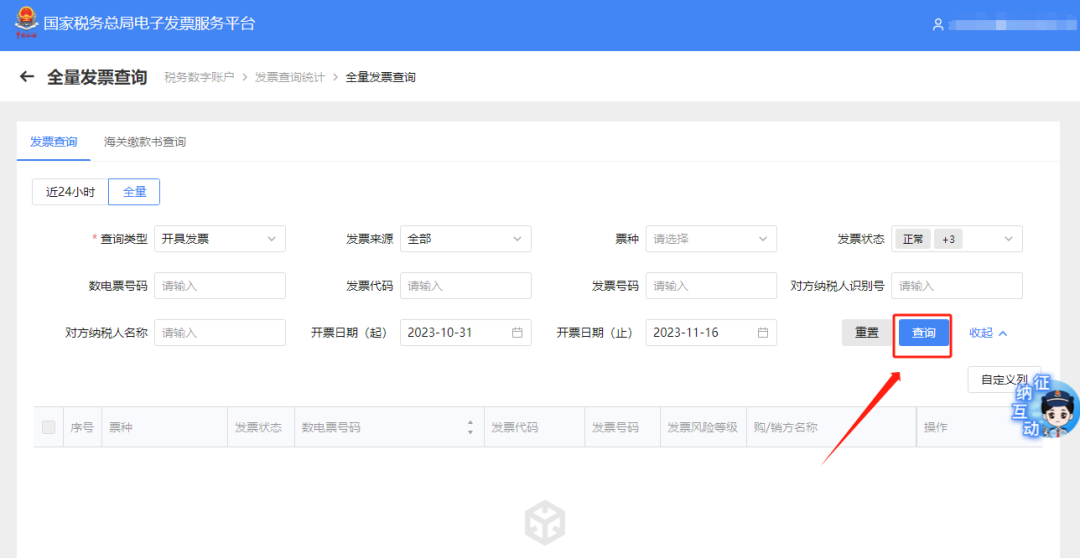 四、全量发票查询模块进入,选择查询条件后点击【查询】,系统会依据条件展示查询结果,在查询结果中选择需要导出的发票数据,点击“导出”即可。